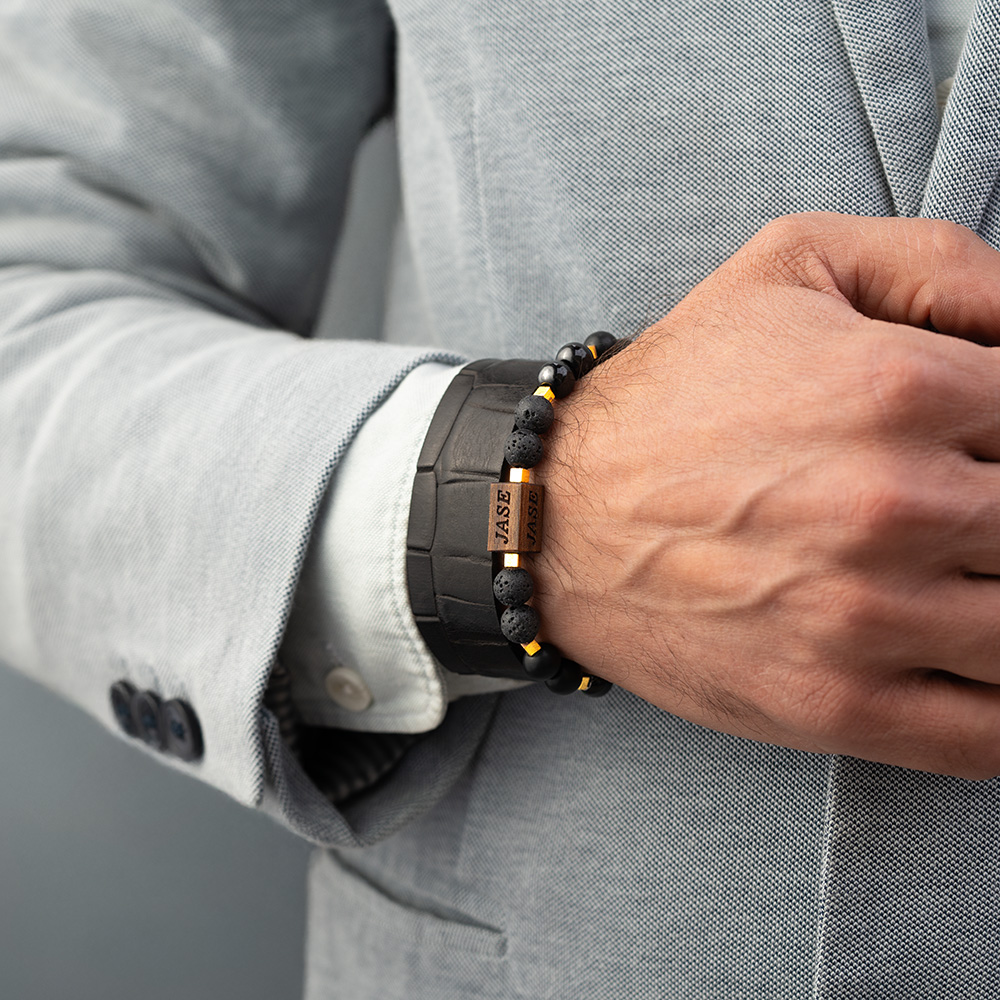 - Very Cool Design!The dark tones are beautifully balanced by the natural wood, preventing it from looking too harsh. It’s an easy and stylish addition to my collection.Comfortable fit. Love the earthy, rugged look.The combination of the rough lava, polished onyx, and metallic hematite is truly brilliant. It makes for a visually compelling and sophisticated piece...MoreThe combination of the rough lava, polished onyx, and metallic hematite is truly brilliant. It makes for a visually compelling and sophisticated piece.This bracelet is a fantastic, versatile piece. It pairs perfectly with both my casual weekend wear and my professional business attire.This bracelet is fantastic for dressing up a casual look. The onyx and hematite are beautiful, and the gold accent beads are very well done.The addition of the gold-colored elements takes this bracelet to the next level. It adds a touch of elegance to the raw lava and wood beads.The hematite shimmer is subtle but striking.Love the gold pop! Looks very premium.Exactly what I hoped for — elegant, minimal, and beautifully made.The gold details really set this piece apart from other beaded bracelets. It makes a perfect gift, and the durability seems top-notch.Masculine and stylish. Perfect fit.Feels sturdy and expensive. Highly recommend.Arrived fast, perfectly packed, and looks even better in person!I bought this for my husband, and he loves the subtle luxury. It’s a great mix of rugged natural stones and polished metal. Excellent craftsmanship!Very pleased with the blend of textures: rough lava, smooth onyx, and the metallic gold shine. It's comfortable and feels very high-quality.Nice work!The different bead materials provide a unique tactile experience. It’s a great piece for a man looking for a subtle, high-quality accessory.Feels solid and well-made. Great daily accessory.Exactly what I hoped for. Elegant, minimal, and beautifully made.Perfect dark color palette. Highly recommended.The dark stones and gold are a great combo.I'm highly impressed with the quality. The elastic is incredibly strong, and the bracelet is robust enough to handle constant, active wear.